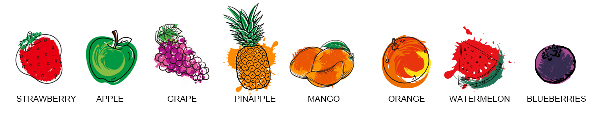 | Sabores variados: | Melancia, Abacaxi, Uva, Mirtilo, Manga, Pêssego |