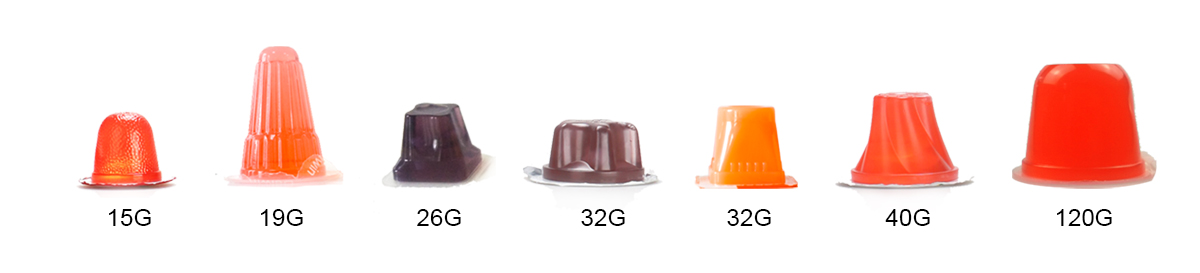 Temos copos de geleia de frutas em forma de lichias e também na forma de pentagramas. Os consumidores podem escolher entre diferentes formas e tamanhos de geleia de frutas.